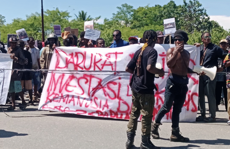 TIMIKA | Ratusan massa yang tergabung dalam Forum Independen Mahasiswa West Papua Komite Pimpinan Kota Timika (FIM-WP-KPK) menggelar aksi demo damai di Kantor DPRK Mimika pada, Senin (10/11/2025).