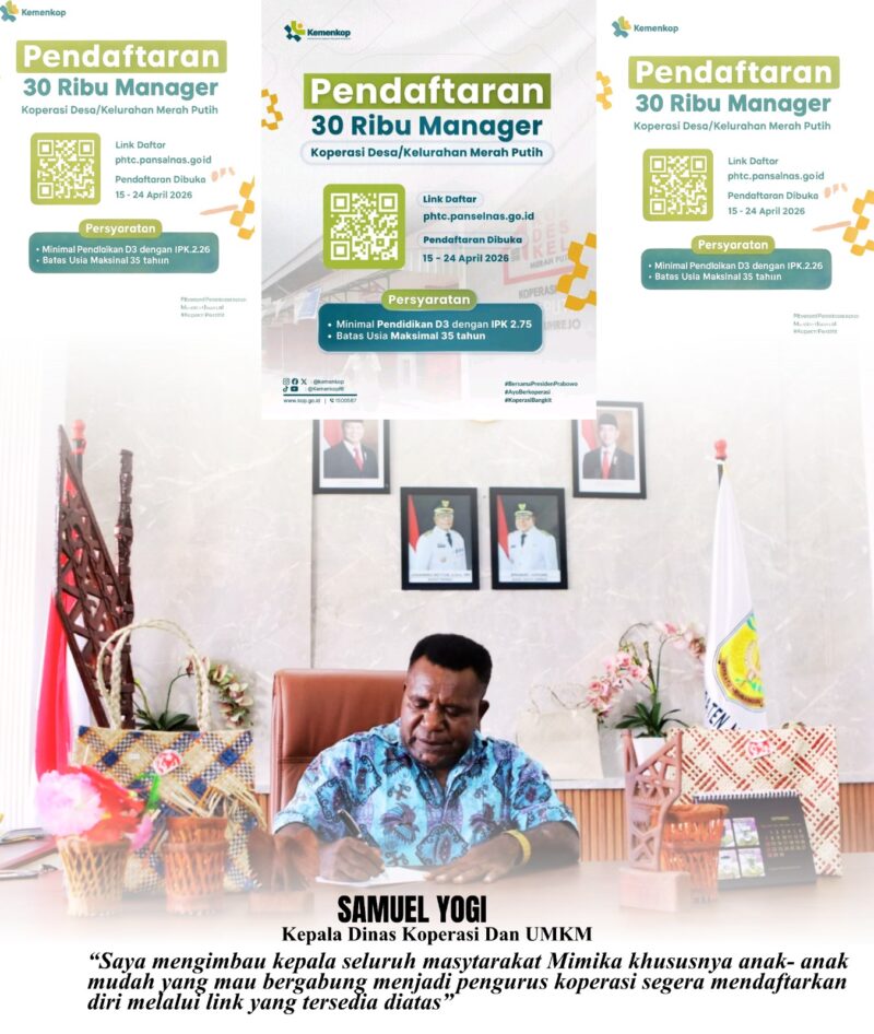 “Saya menyampaikan masyarakat Mimika yang mau bergabung dalam koperasi merah Putih. Untuk segera mendafarkan diri pada website resmi yang telah dikeluarkan oleh pemerintah,”ungkap Samuel Yogi pada, Selasa (21/4/2026).