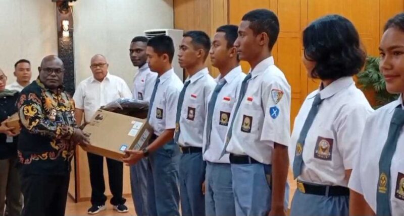 TIMIKA | Gubernur Provinsi Papua Tengah, Meki Frits Nawipa menyerahkan bantuan laptop kepada 9 siswa – siswi asal Kabupaten Mimika yang menjadi anggota Paskibra tingkat Provinsi pada HUT ke-80 RI tahun 2025.Penyerahan laptop brlangsung di Hotel Grand Tembaga, Selasa (9/9/2025).